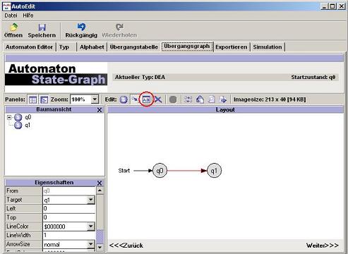 Unter "Übergangsgraph" können Sie Zustände und Übergänge grafisch dargestellt sehen und Sie haben die Möglichkeit, auch dort selbige zu erstellen, zu löschen oder zu editieren. Dazu stehen Ihnen die Schaltflächen über der Grafik zur Verfügung. Diese haben dieselbe Anordnung und Funktion, wie auch in der Übergangstabelle, allerdings gibt es hier zum Umschalten von Endzustand oder nicht-Endzustand noch eine weitere.